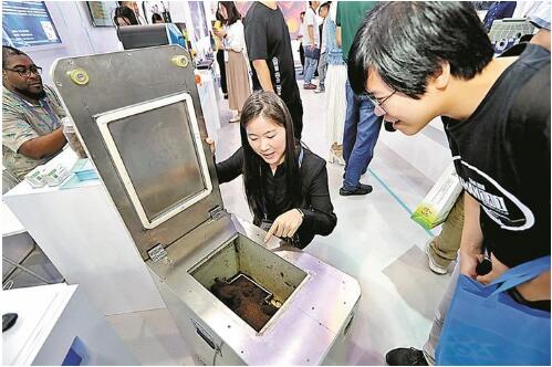 市民正在了解有機制肥機工作原理。